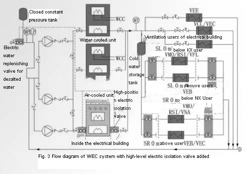 In the original design of WEC system, manual isolation valves were set before and after water cooling units, air cooling units and cold water pumps. The isolation valves before and after the operation train are normally open, and the isolation valves of the standby train and the air-cooled train are normally closed. The switch before running column and standby column is manual switch. When switching between columns, it is necessary to manually switch the corresponding isolation valves locally. Manual switching takes a certain time, during which the cold water storage tank in the system provides continuous cold source for end users. In order to improve the automation level of WEC system, the original scheme is optimized and improved as follows: