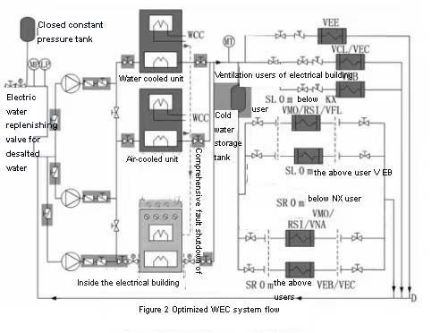 WEC system is equipped with two water-cooled chillers and corresponding cold water pumps, one modular air cooled chiller and corresponding cold water pumps. In addition, a cold water storage tank is set up to provide continuous cold water for end users when the chiller is switched. Under normal working conditions, the water-cooled series of train a or train b operates, while the water-cooled series of the other train is set aside. The air-cooled unit is in hot standby state. Under the condition of losing the final heat sink, the water-cooled unit fails, and the running water-cooled series cold pumps continue to run at this time. During the period before the start of the air-cooled unit, cold water is supplied to the end users through the cold water storage tank until the start of the air-cooled unit series is completed.